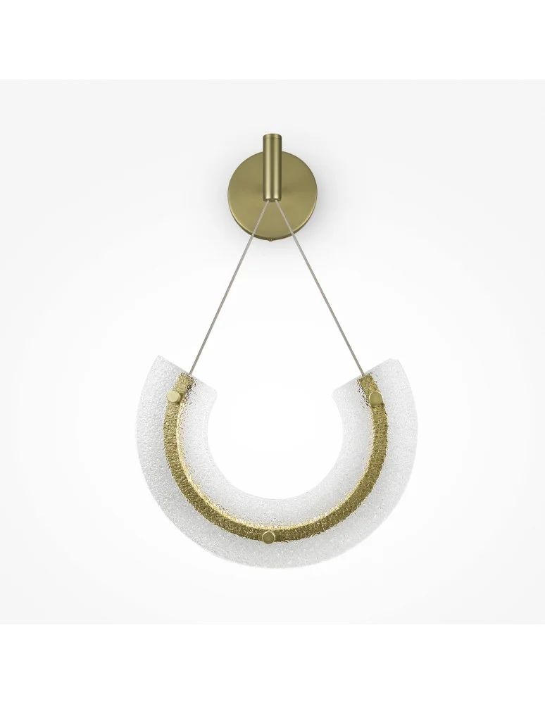 Metalowa oprawa w kolorze złotym. Wystrój – teksturowane przezroczyste szkło. Wystrój inspirowany biżuterią Mezoameryki. Źródło światła: LED. Temperatura barwowa 3000K.