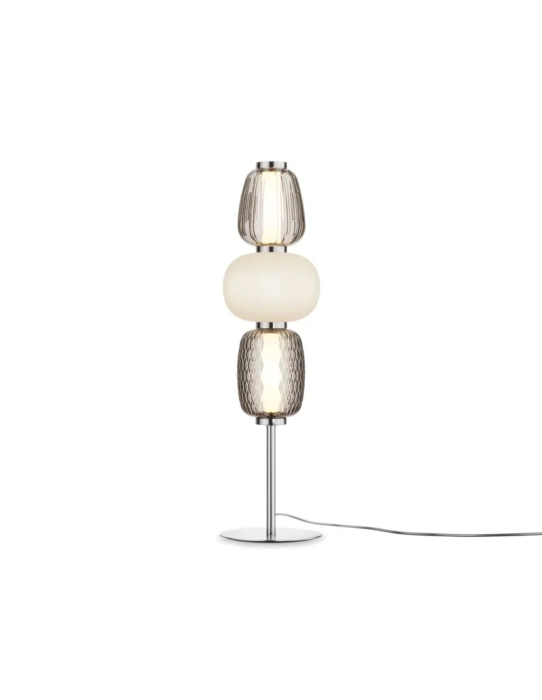 Armatura jest metal, kolory są-złoty, chrom. Mieszanka kloszów o zaokrąglonych i wydłużonych kształtach z białego matowego i przezroczystego szkła z siatką i liniowym powtarzającym się wzorem reliefowym. Źródło światła jest LED, temperatura barwowa jest 3000K.