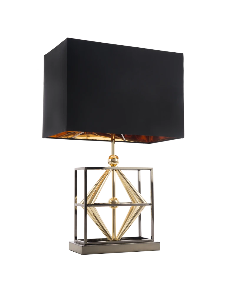 Nowoczesna, geometryczna.QUITO fantastycznie udekoruje komodę lub szafkę nocną. Podstawa tej lampy stołowej jest dostępna w kolorach gun-black oraz złotym. Lampa ma wysokość 64 cm. Abażur na zewnątrz czarny, a w środku pokryty srebrną folią PVC odbija światło dobrze komponuje się z chromowaną podstawą.