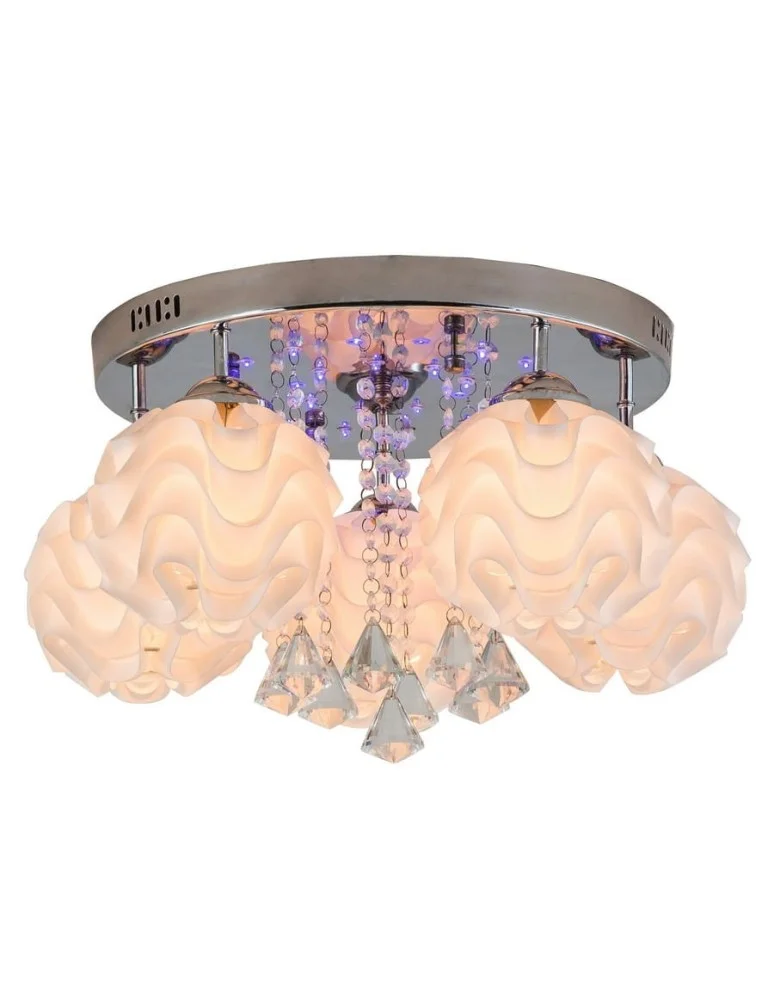 Sada 5 plafon - to jedna z najbardziej oryginalnych, nowoczesnych i designerskich lamp w Naszym asortymencie, jeśli chodzi o plafony. Oprawa posiada, pięć mniejszych kloszy, wykonanych z tworzywa sztucznego, w kształcie falowanych kul. Całość na srebrnym, okrągłym stelażu. Klosze są koloru białego/ kremowego, co sprawia, że lampa Sada wpasuje się do większych stylizacji wnętrz. Najciekawsze jest to, że lampa prócz pięciu źródeł światła, jakimi są żarówki - E14, posiada jeszcze wbudowane, punktowe oświetlenie LED, które świecą kolorem! A mianowicie w kolorach czerwonym, fioletowym, niebieskim. Dzięki temu, oświetlenie to daje niepowtarzalny blask. Produkt ten, przeznaczony najbardziej do salonu i sypialni. Z całą pewnością nikt nie przejdzie obok niej z obojętnością, ponieważ przykuwa uwagę swą innowacyjnością! W zestawie dołączony jest pilot.