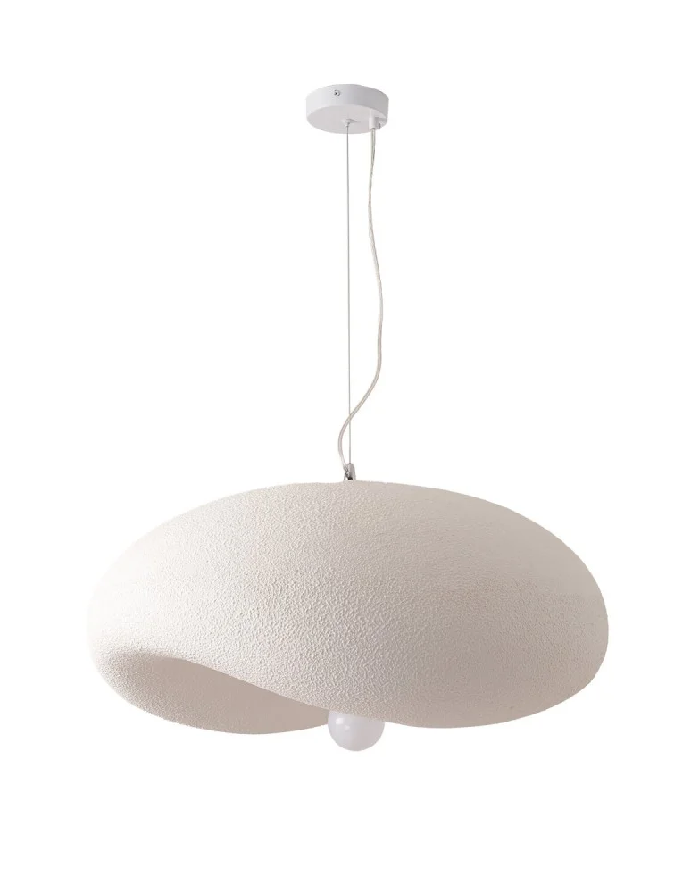 Lampa STONE FLAT ma niesymetryczny klosz wykonany z lekkiego tworzywa w odcieniu ciepłej bieli. Oprawa oświetleniowa zawieszona jest na białym przewodzie o długości 200 cm.