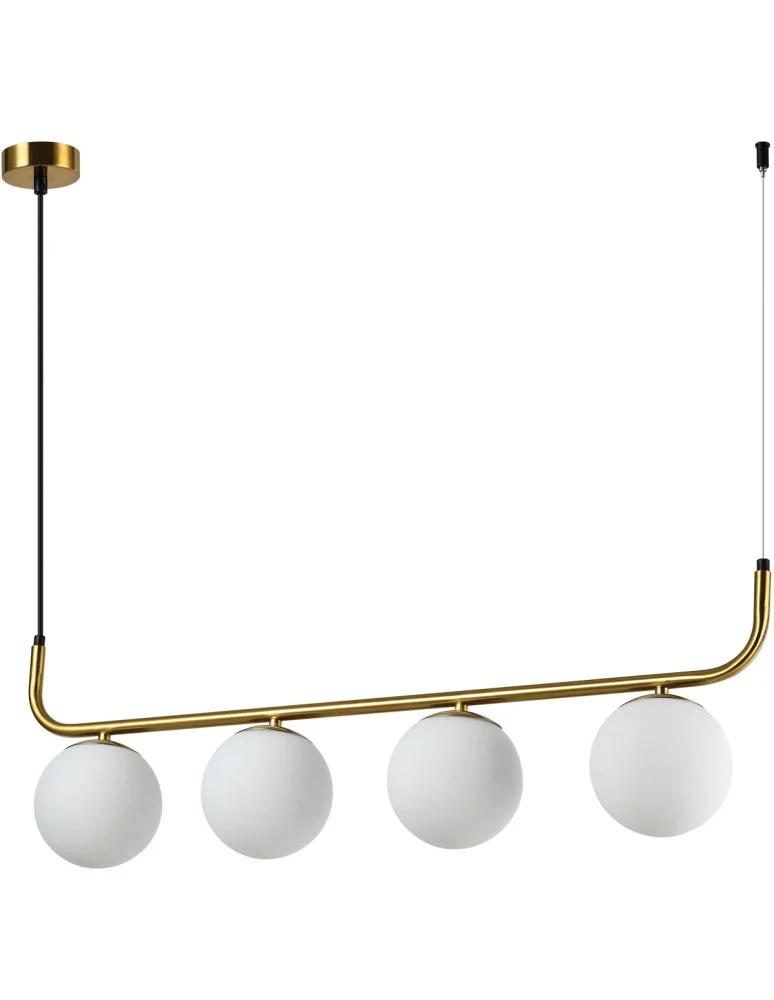 Lampa wisząca Alisa 4 to elegancki i funkcjonalny dodatek do każdego wnętrza, wykonany z metalu w kolorze złota i wyposażony w cztery szklane klosze. Mleczne klosze lampy zapewniają delikatne, rozproszone światło, tworząc przyjemną atmosferę w pomieszczeniu.