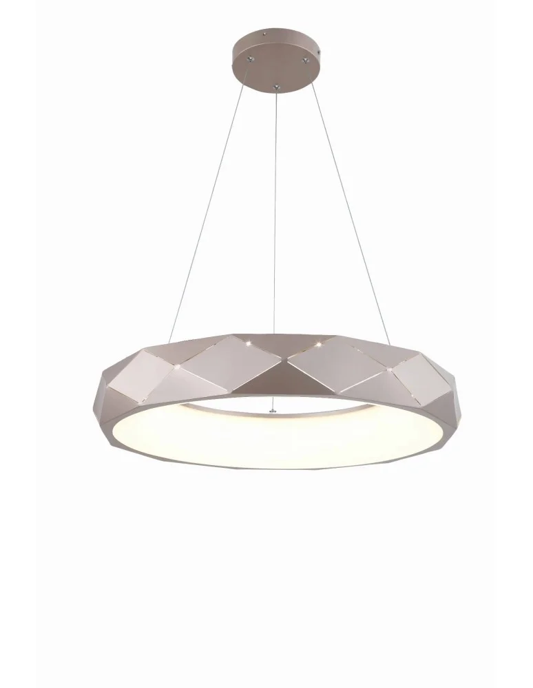 LAMPA WISZĄCA REUS LED ZŁOTA, jak sama nazwa wskazuje, jest produktem oświetleniowym z kategorii - lampy wiszące. Model ten charakteryzuje się piękną oprawą oświetleniową, która przedstawia duży “pierścień” posiadający na swej zewnętrznej stronie dekoracje w kształcie rombów i trójkątów. Ponadto, lampa ta ma wbudowane światło LED o neutralnej barwie, która z pewnością będzie pasować do wielu pomieszczeń, jak salon, jadalnia, czy pokój gościnny. Ta oprawa oświetleniowa wykonana została w większości z metalu. Ponadto, złoty kolor jaki posiada ta lampa REUS nadaje niesamowitej elegancji. Pięknie będzie kontrastować z bielą, ciemną zielenią, a nawet czerwienią i czernią. Z pewnością, oświetlenie to pięknie prezentować się będzie w stylizacjach nowoczesnych, eleganckich oraz glamour. Lampa wisząca REUS LED ZŁOTA, to nie tylko oświetlenie, ale także przepiękna dekoracja wnętrza. W naszym asortymencie znaleźć można podobny model lampy, jednakże z nieco innym źródłem światła. Życzymy miłych i udanych zakupów!