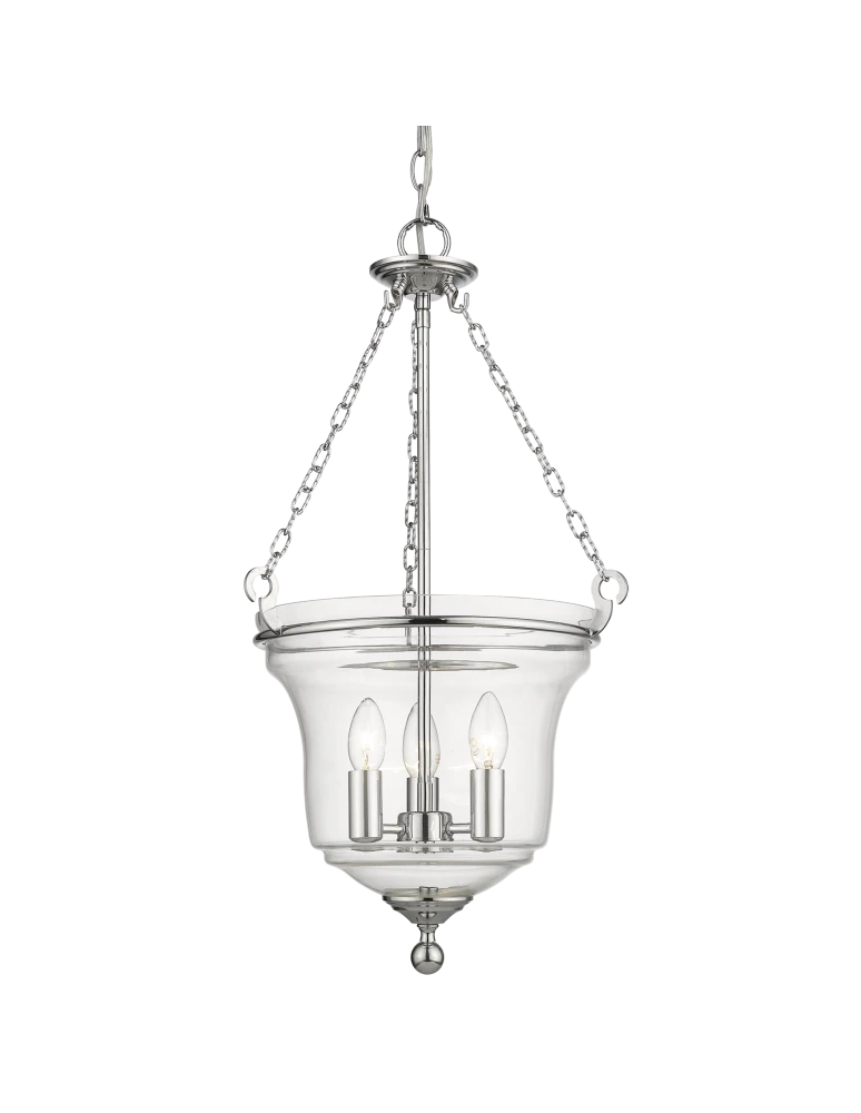 Niezwykła, intrygująca.Ten model PRAGUE jest lampą o ciekawym kształcie. Szklany klosz otwarty z góry, w którym są skryte trzy świeczniki na dole zakończony jest ozdobnym elementem. Całość wisi na trzech łańcuchach, przez co oprócz przyciągającego wzrok designu gwarantuje również trwałość konstrukcji i stylu.
