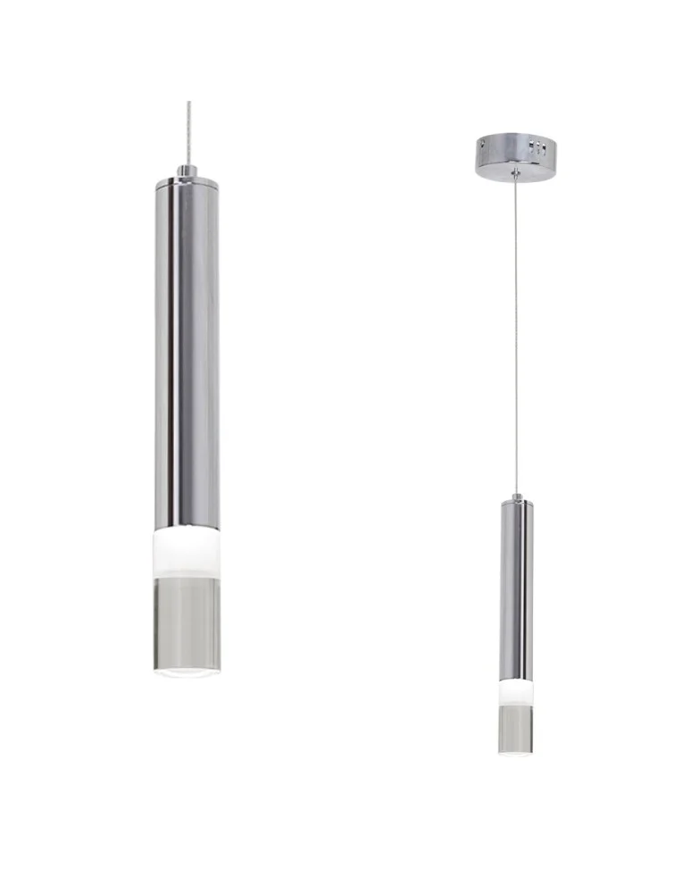 "Stylowa lampa, która została zaprojektowana w taki sposób, że istnieje możliwość regulacji wysokości położenia elementu świetlnego od 40 do 100 cm. Dzięki takiemu rozwiązaniu z łatwością można ją dopasować do wnętrz o dowolnej wysokości. Źródłem światła jest zainstalowany na stałe moduł LED o mocy 5 W, odpowiadający 31 W tradycyjnej żarówki. Strumień świetlny o 350 lm ma neutralną i przyjemną dla oka barwę 4000 K. Lampa została wykonana z metalu oraz akrylu, wykończona w kolorze chromowanym. W zestawie oprócz lampy znajdują się wszystkie niezbędne elementy przeznaczone do montażu.