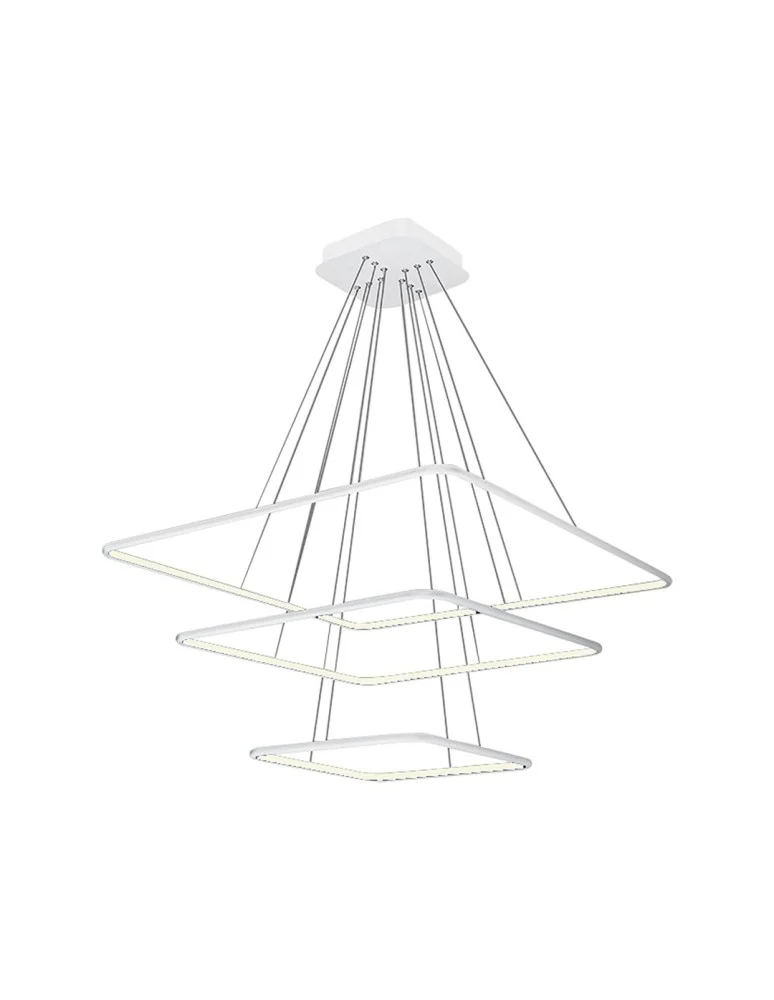 NIX WHITE 515 to wisząca lampa sufitowa od marki MiLAGRO. Składa się z trzech opraw, w kształcie kwadratów ułożonych poziomo. W oprawach o zróżnicowanej wielkości umieszczono trzy źródła światła w formie modułu LED. Szerokość lampy w najszerszym miejscu wynosi 80 cm, a szerokość najmniejszej obudowy sięga 40 cm. Obudowy znajdują się na czterech regulowanych zawiesiach każda. Z drugiej strony przyczepiono je do kwadratowej podsufitki. Wymienne moduły LED świecą ciepłą, białą barwą o temperaturze 3000 K. Strumień świetlny tego urządzenia to 8190 lm. Energooszczędny LED ma moc 117 W, co odpowiada mocy 585 W w przypadku tradycyjnej żarówki.