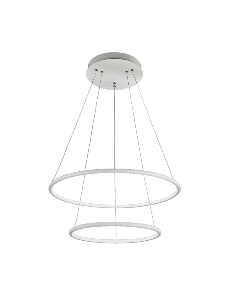 Stylowa lampa z kolekcji Orion została zaprojektowana w taki sposób, że istnieje możliwość regulacji wysokości położenia elementu świetlnego od 40 do 100 cm. Dzięki takiemu rozwiązaniu z łatwością można ją dopasować do wnętrz o dowolnej wysokości. Źródłem światła są dwa wymienne moduły LED o łącznej mocy 53 W, zamontowane w okrągłych oprawach o średnicy 40 cm i 60 cm. Strumień świetlny ma 3710 lm i neutralną, przyjemną dla oka barwę 3000 K. Lampa została wykonana z metalu oraz akrylu, wykończona w kolorze białym matowym. W zestawie oprócz lampy znajdują się wszystkie niezbędne elementy przeznaczone do montażu.