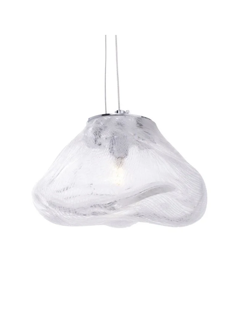 Lampa zawieszona jest na delikatnym kablu w transparentnym oplocie, uwieńczonym chromowaną rozetą