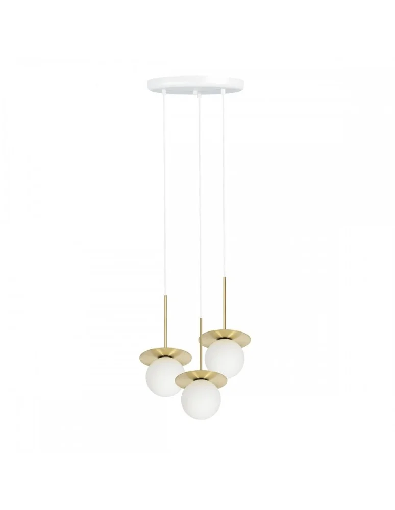 • potrójna lampa sufitowa wisząca • metal / szkło • szczotkowany mosiądz / biały • długość 160cm • szklane klosze w kolorze białym matowym fi 15cm • biała podsufitka 30cm • metalowy krążek fi 20cm • przewód dwużyłowy 2 X 0.75mm2 w oplocie białym poliestrowym • gwint G9 • max 3x12W • IP20