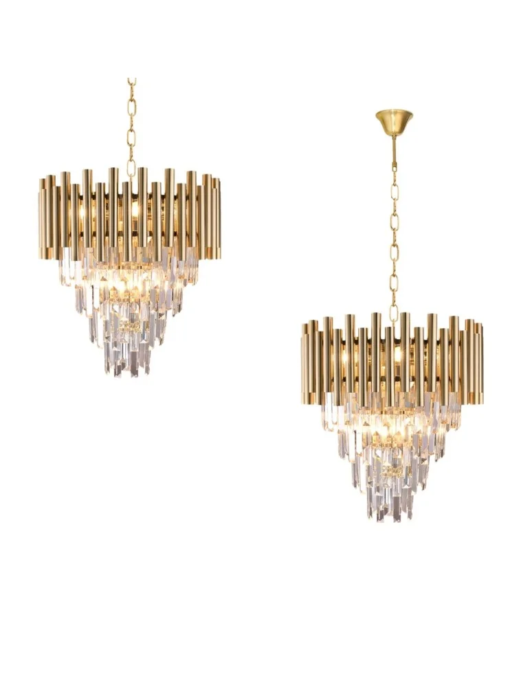 Żyrandol charakteryzuje się nietuzinkowym designem. Nowatorskie połączenie kryształów z geometrycznymi rurkami zadowoli nawet najbardziej wymagających klientów, szukających oryginalnych dodatków do wnętrz. Lampa MADISON GOLD w kolorze złotym została wykonana z wysokiej jakości metalu oraz kryształu.